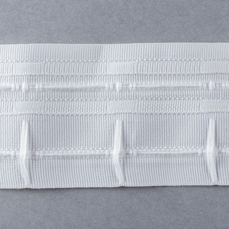 Шторная лента мягкая, не прозрачная для плотных тюлевых полотен и портьерных тканей c карандашной складкой. Сокращение - регулируемое, произвольное, 2 ряда белых текстильных кармашков, стягивается на 4 нитки, крепление - крючки.