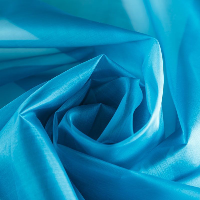 Шелковая невесомая органза с искрящейся поверхностью сине-зеленого оттенка. Ткань легкая, тонкая, пластичная, хорошо драпируется, просвечивает, отлично держит форму. Подойдет на блузку, рубашку, платье, тунику или юбку на подкладе.
