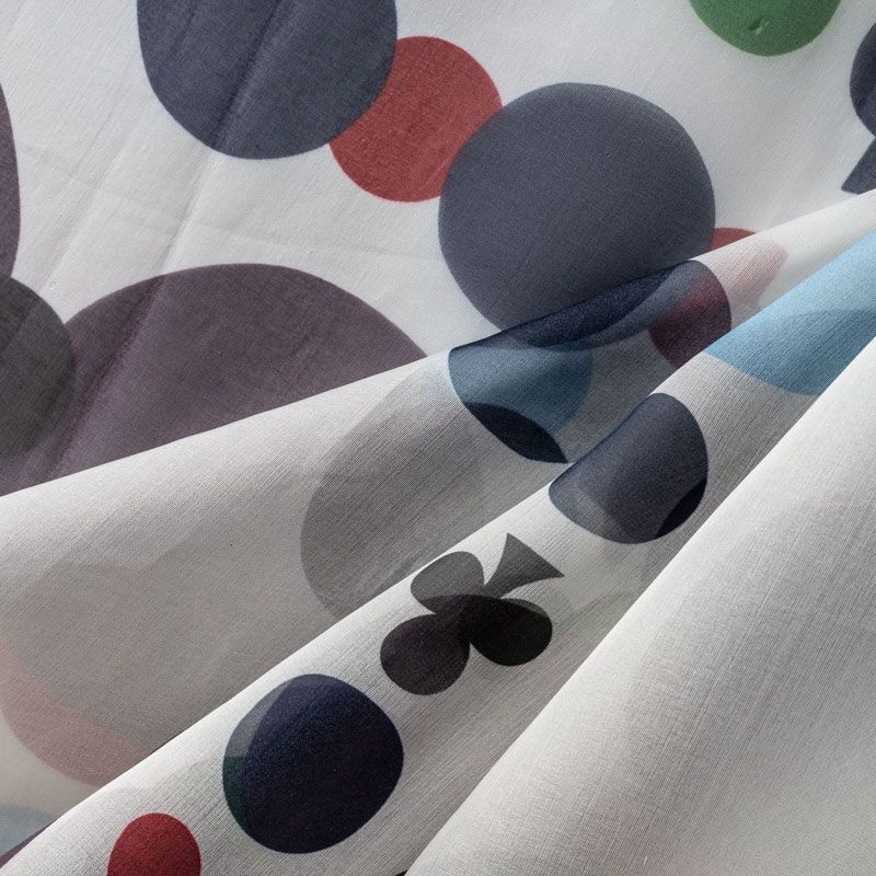 Шелковая органза с крупным ярким абстрактным принтом на молочном фоне. Имеет слегка рельефную поверхность за счет вискозы. Хорошо держит форму, легкая, тонкая, просвечивает. Подойдет на блузку, платье, тунику или юбку.