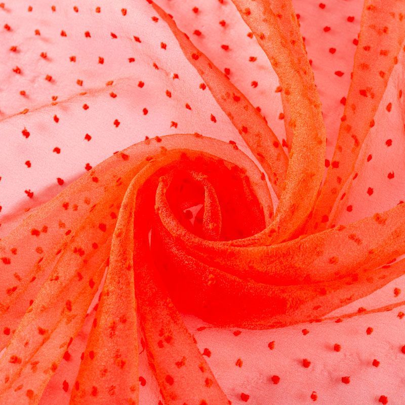 Легчайший, изящный, воздушнный и прозрачный материал с благородной переливчатой поверхностью. Прекрасно держит форму в заложеных складках. На лицевой стороне объемные декоративные элементы из флока диаметром 0.5 см. Подойдет для создания в изделии декоративных деталей, новогодних костюмов, нарядных платьев, блузок.