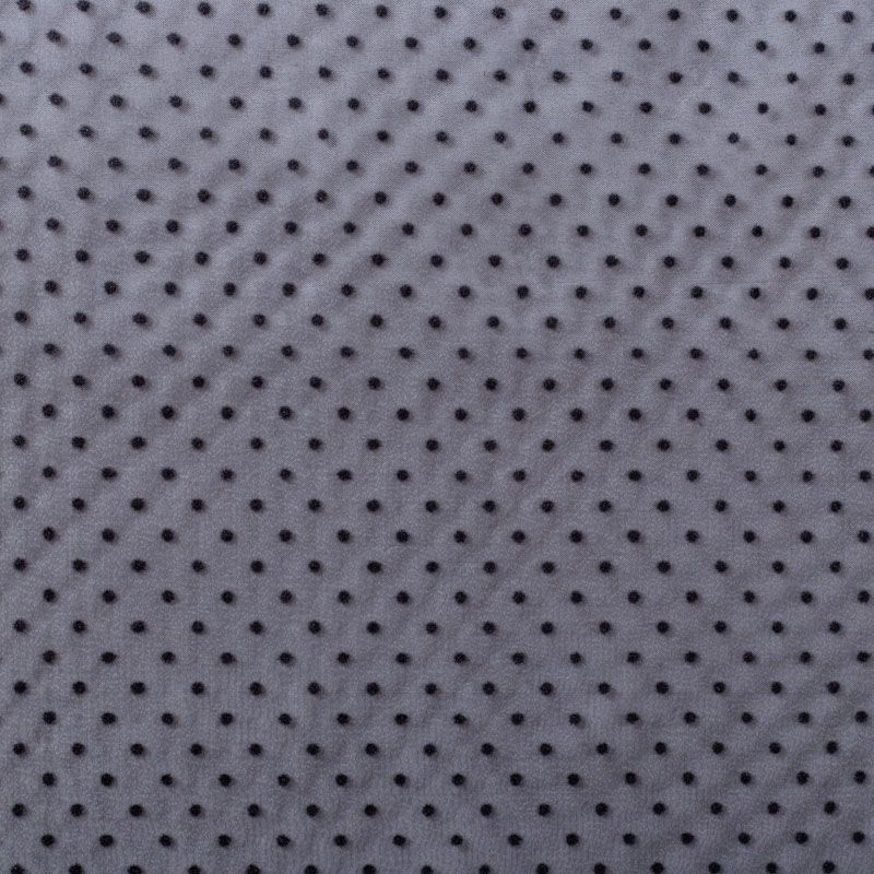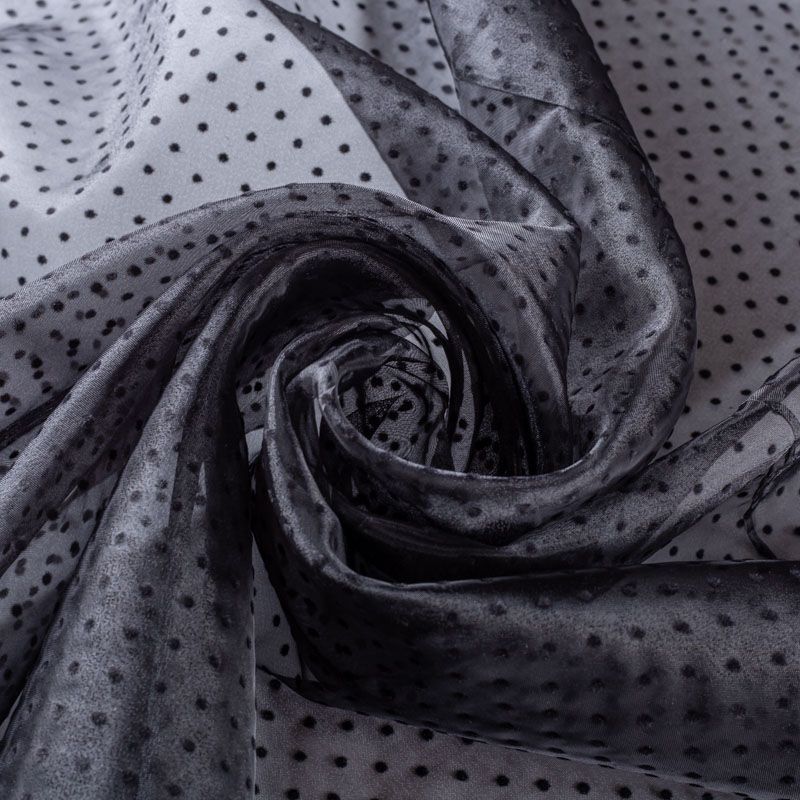 Легчайший, изящный, воздушнный и прозрачный материал с благородной переливчатой поверхностью. Прекрасно держит форму в заложеных складках. На лицевой стороне объемные декоративные элементы из флока диаметром 0.5 см. Подойдет для создания в изделии декоративных деталей, новогодних костюмов, нарядных платьев, блузок.