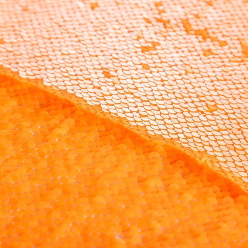 Двухсторонние пайетки неонового оранжевого оттенка, вышиты по типу чешуи на эластичной трикотажной основе белого цвета. Лицевая сторона глянцевая, изнаночная — матовая. Ткань яркая и выразительная, красиво переливается, очень нарядная, хорошо драпируется, пластичная и эластичная и в длину, и в ширину, благодаря чему изделия получаются комфортными и отлично сидят по фигуре. Пайетки — идеальный материал для праздников и вечеринок, также отлично впишутся в стиль "спорт-шик". Из них получится эффектное платье, жакет, боди, топ, туника, юбка или комбинезон.