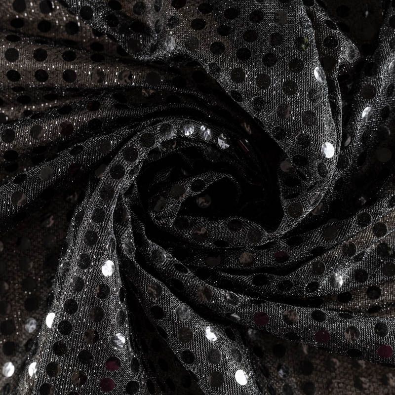 Полупрозрачный переливающийся материал, основа которого, из тонкого сетчатого трикотажа с люрексом. Полотно усеяно блестящими зеркальными круглыми пайетками диаметром 6 мм. Ткань идеально подойдет для декорирования элементов костюма, пошива вечерних нарядов, концертных и танцевальных костюмов.