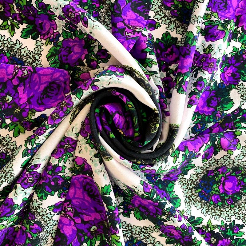 Платок выполнен из натурального итальянского шелка с креповой поверхностью. Очень красивый рисунок в фольклорном стиле по типу павлопосадских узоров в фиолетовом цвете на черном фоне. Шикарная вещь украсит образ и будет отличным дополнением к Вашему наряду.