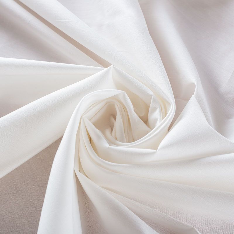Однотонный плательно-рубашечный хлопковый поплин молочного оттенка. Ткань лёгкая, слегка прозрачная, поверхность матовая, гладкая, приятная к телу, хорошо драпируется, тянется за счет эластана в составе. Прекрасно подойдет блузы, платья-рубашки, летнего сарафана, туники.