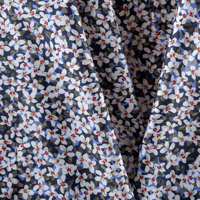 Блузочно-рубашечный хлопок сатинового плетения с мелким цветочным принтом. Ткань тонкая, легкая, слегка прозрачная, мягкая и шелковистая на ощупь. Сатин очень пластичный, хорошо драпируется, немного держит форму. Подойдет для пошива различных предметов летнего гардероба: платья, сарафана, туники, рубашки, топа.