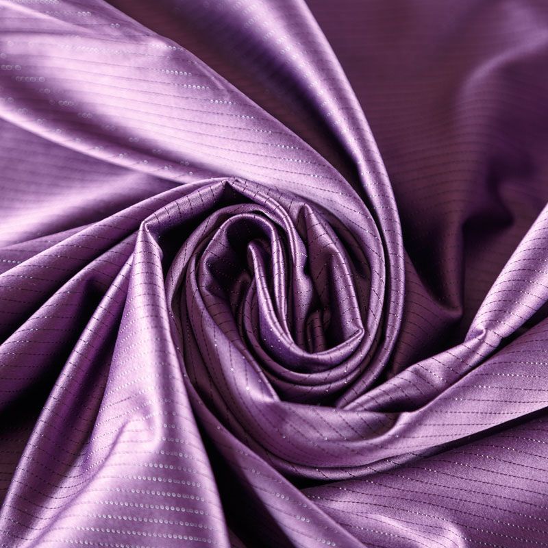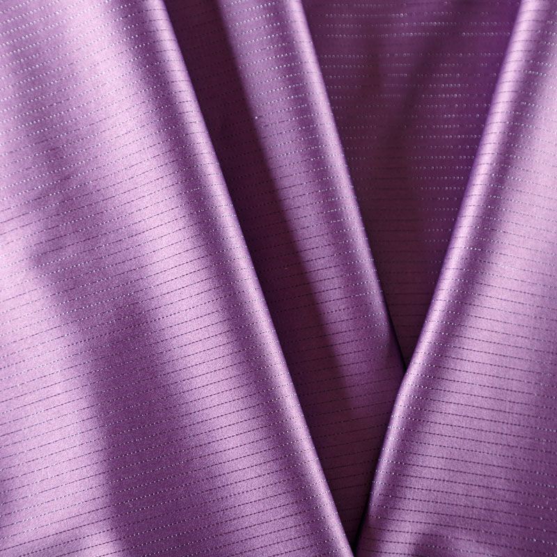 Сатин-коттон в сиреневом оттенке с тонкими полосками люрексовой нити. Поверхность гладкая со сдержанным блеском, ткань средней плотности, не толстая, хорошо держит форму, тянется за счет эластана в составе. Подойдет для пошива костюма, жакета, юбки, платья, брюк или шорт.