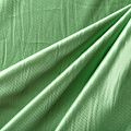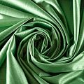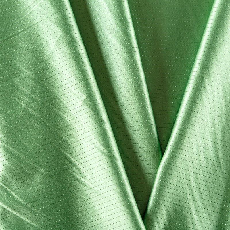 Сатин-коттон в зеленом оттенке с тонкими полосками люрексовой нити. Поверхность гладкая со сдержанным блеском, ткань средней плотности, не толстая, хорошо держит форму, тянется за счет эластана в составе. Подойдет для пошива костюма, жакета, юбки, платья, брюк или шорт.
