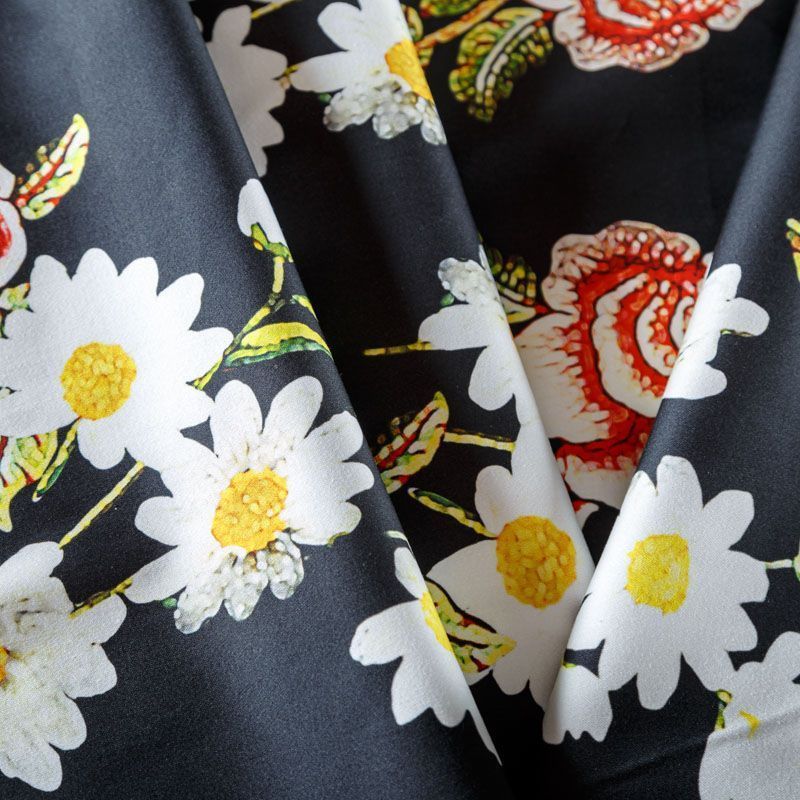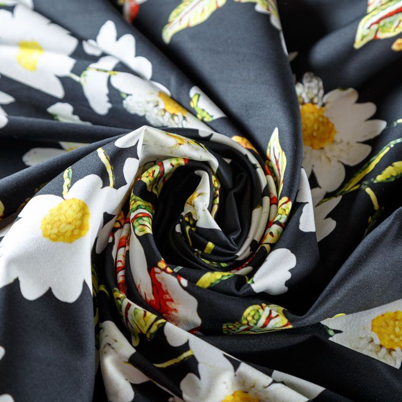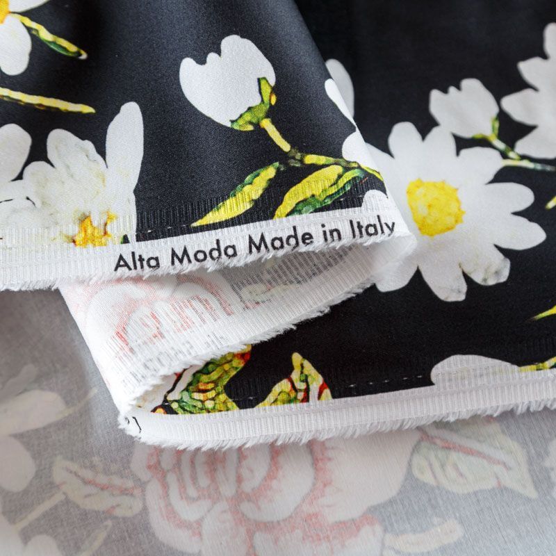 Итальянский сатин-коттон в черном оттенке с цветочным принтом. Поверхность гладкая со сдержанным блеском, ткань средней плотности,  не толстая, хорошо держит форму, тянется за счет эластана в составе. Подойдет для пошива костюма, жакета, юбки, платья, брюк или шорт.