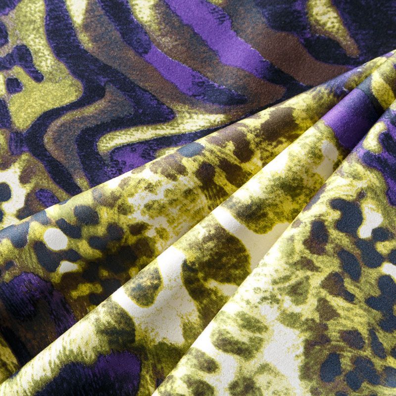 Итальянский сатин-коттон оливкового оттенка с контрастным анималистическим принтом. Поверхность гладкая со сдержанным блеском, ткань средней плотности, не толстая, хорошо держит форму, тянется за счет эластана в составе. Подойдет для пошива костюма, жакета, юбки, платья, брюк или шорт.
