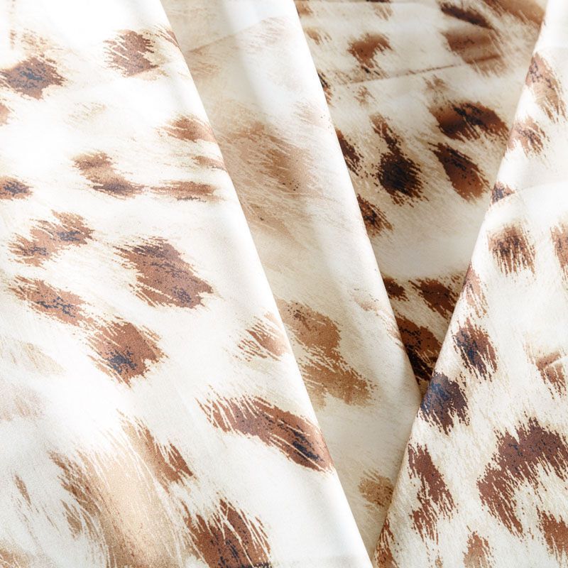 Итальянский сатин-коттон в молочном цвете с анималистическим принтом в природных оттенках. Поверхность гладкая со сдержанным блеском, ткань средней плотности,  не толстая, хорошо держит форму, тянется за счет эластана в составе. Подойдет для пошива костюма, жакета, юбки, платья, брюк или шорт.