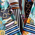 Сатин-коттон в мятном цвете с абстрактно-цветочным принтом. Поверхность гладкая со сдержанным блеском, ткань средней плотности, не толстая, хорошо держит форму, тянется за счет эластана в составе. Подойдет для пошива костюма, жакета, юбки, платья, брюк или шорт.