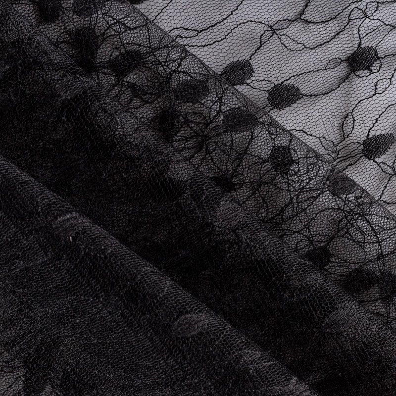 Тонкое, нежное, мягкое и прозрачное полотно, состоящее из мелких ячеек, на которых нанесен рельефный плетеный растительный принт.  Красиво драпируется, тянется, применяется для декорирования деталей одежды, например, рукавов изделия, для пошива нарядной и повседневной одежды: топов, блузок, пышных юбок и платьев.