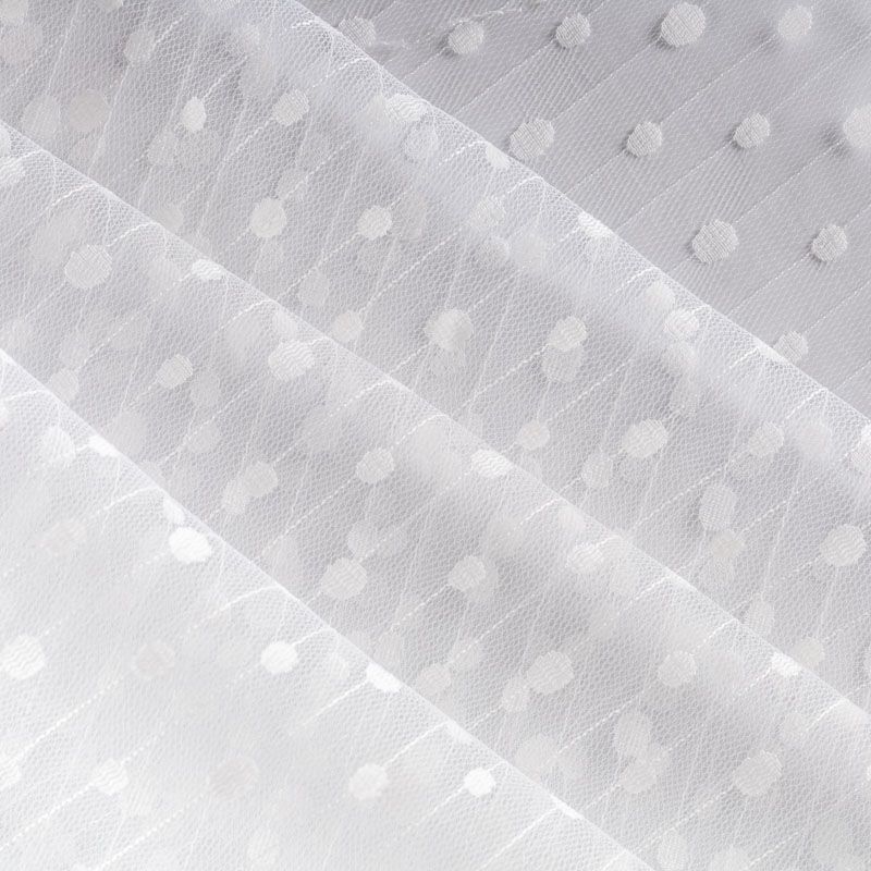Тонкое, нежное, мягкое и прозрачное полотно, состоящее из мелких ячеек, на которых нанесен рельефный плетеный принт в виде тонких полосок с горошинами. Красиво драпируется, тянется, применяется для декорирования деталей одежды, например, рукавов изделия, для пошива нарядной и повседневной одежды: топов, блузок, пышных юбок и платьев.