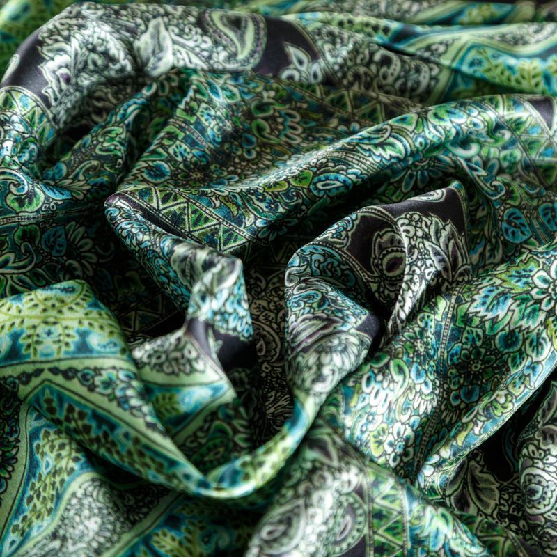 Итальянский атласный шелк с богатым орнаментом в зеленых оттенках. Ткань тонкая, не просвечивает, отлично драпируется, легкая и струящаяся, тянется за счет эластана в составе. Идеально подойдет для пошива платьев и сарафанов расклешенных моделей, с воланами, летящих юбок, топов, блузки, костюма в пижамном стиле.