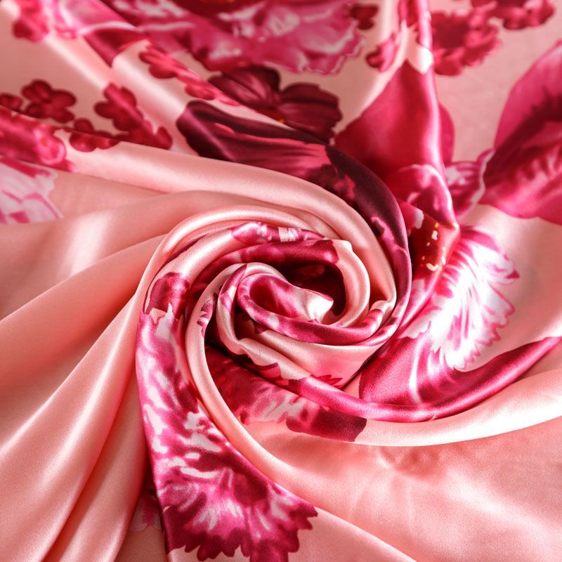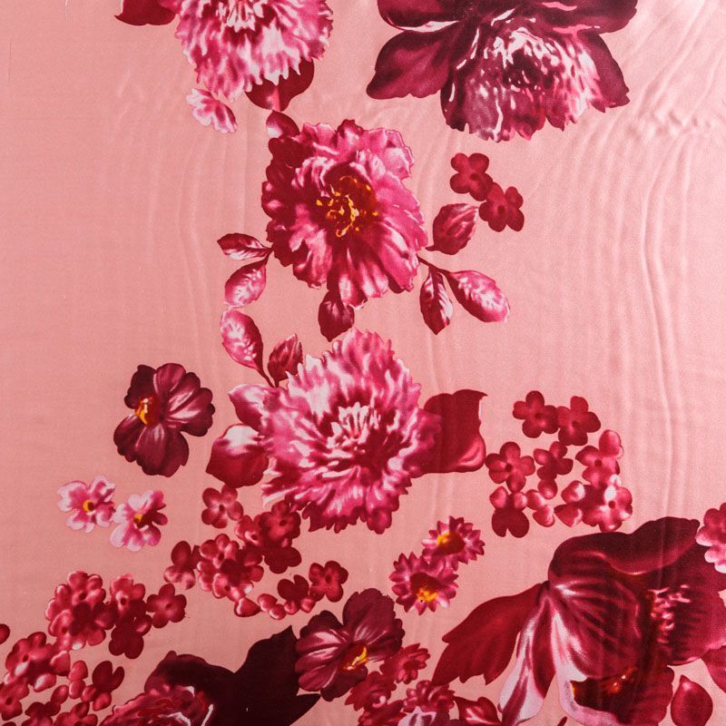 Итальянский атласный шелк с цветочным принтом на розовом фоне. Ткань тонкая, не просвечивает, отлично драпируется, легкая и струящаяся. Идеально подойдет для пошива платьев и сарафанов расклешенных моделей, с воланами, летящих юбок, топов, блузки, костюма в пижамном стиле.