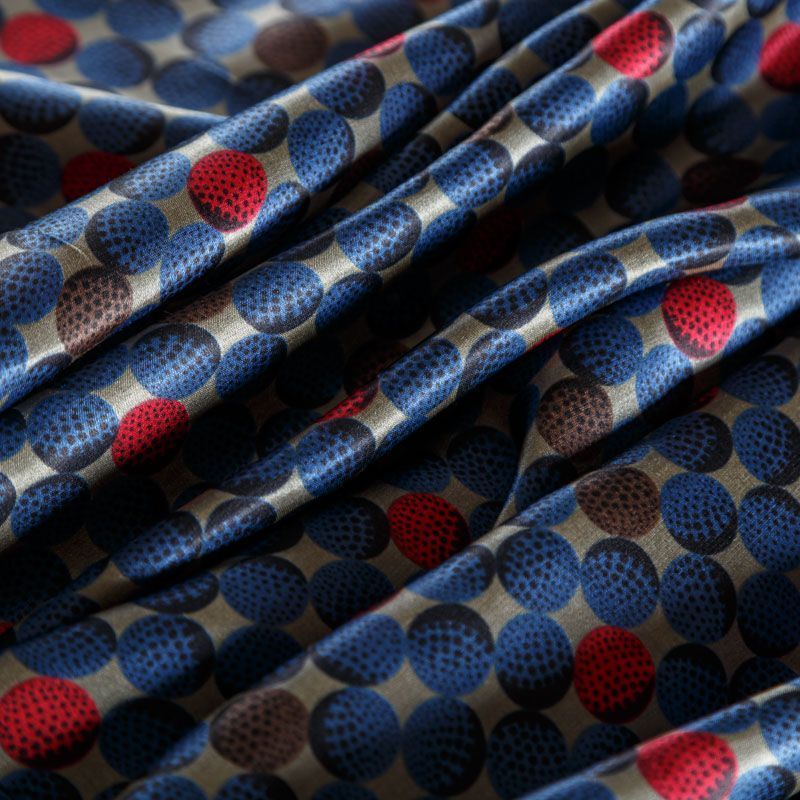 Итальянский атласный шелк с геометрическим принтом на фоне цвета хаки. Ткань тонкая, не просвечивает, отлично драпируется, легкая и струящаяся. Идеально подойдет для пошива платьев и сарафанов расклешенных моделей, с воланами, летящих юбок, топов, блузки, костюма в пижамном стиле.