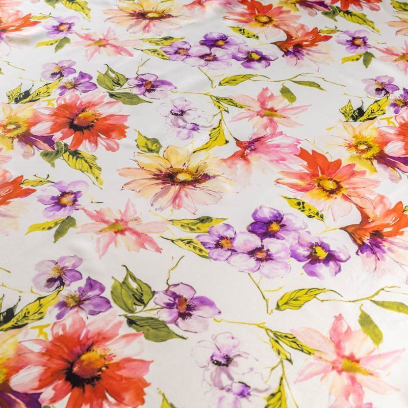 Итальянский матовый шелк с акварельным цветочным  принтом на молочном фоне, тонкий, слегка прозрачный, отлично драпируется, тянется за счет эластана в составе, легкий и струящийся с креповой поверхностью. Идеально подойдет для пошива платьев и сарафанов расклешенных моделей, с воланами, летящих юбок, топов, блузки, костюма в пижамном стиле.