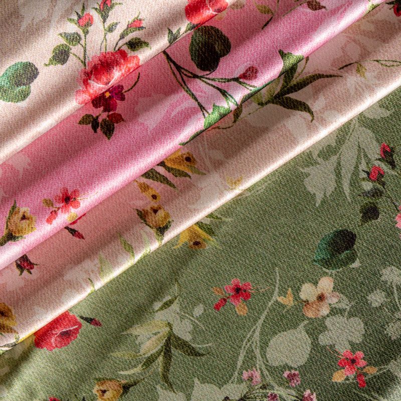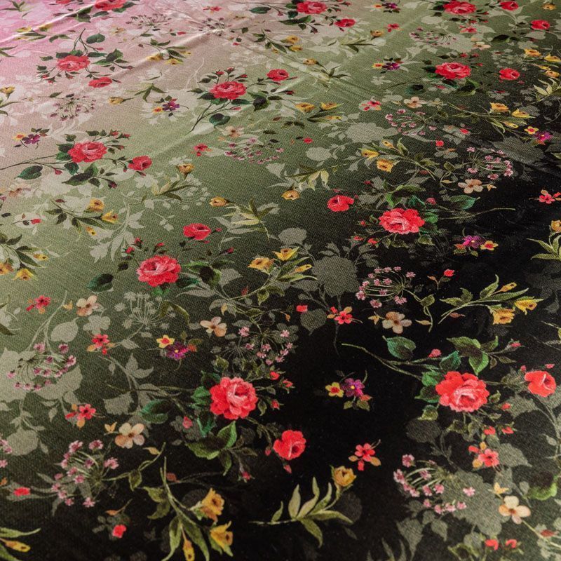 Итальянский натуральный шелк с эффектом деграде с плавным переходом от хаки до яркого-розового цвета, дополненный цветочным принтом, подойдет для ценителей ярких образов. Ткань имеет атласную поверхность, легкая, тонкая, струящаяся, хорошо драпируется. Будет идеальна для пошива летнего сарафана, платья, блузки, костюма в пижамном стиле, широких брюк или юбки.