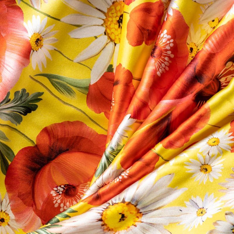 Итальянский атласный шелк, дизайн которого вдохновлен образом из коллекции известного бренда. На солнечном теплом фоне здесь - лаконичный и очень летний рисунок в виде ромашек и красных маков. Ткань средней плотности, не просвечивает, струится, хорошо драпируется. Поверхность глядкая, имеет благородный сатиновый блеск. Подойдет для летних платьев, накидок, юбок, блузок, костюмов, широких брюк, домашней одежды.