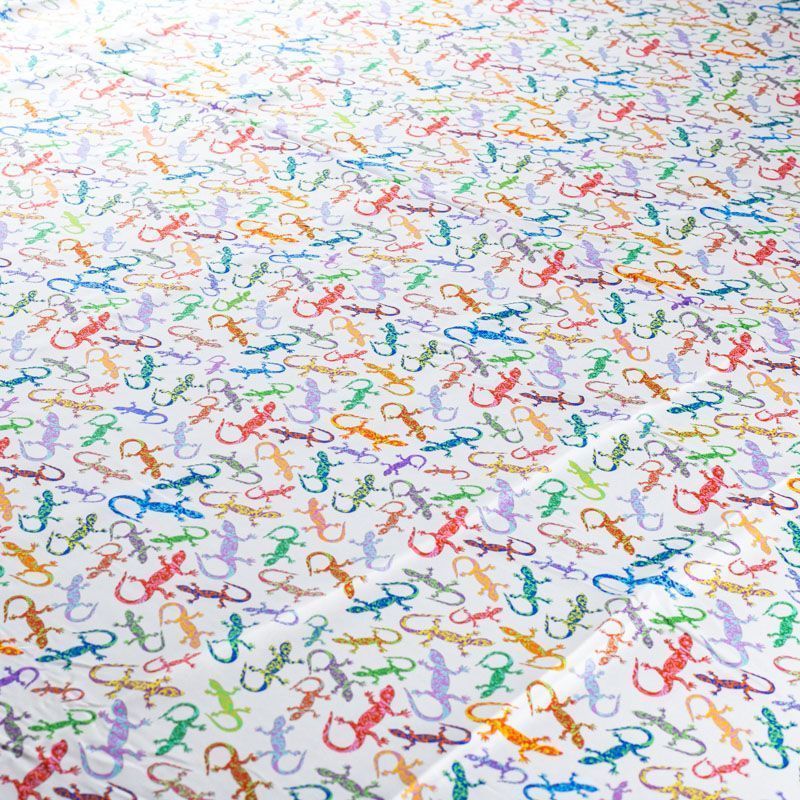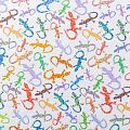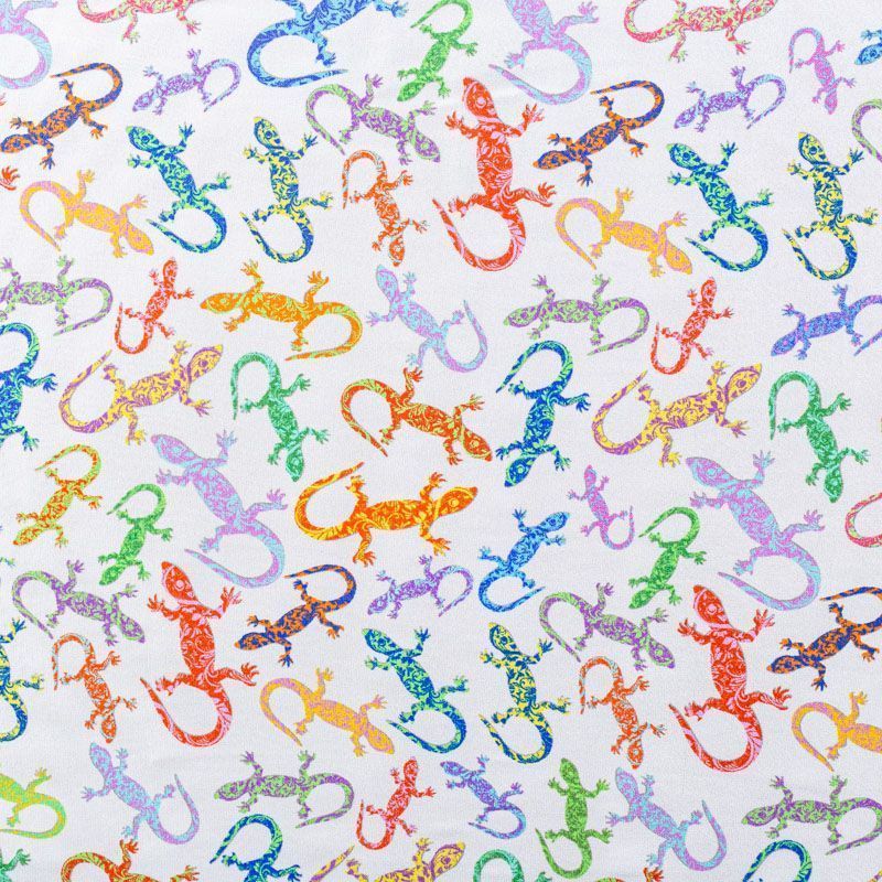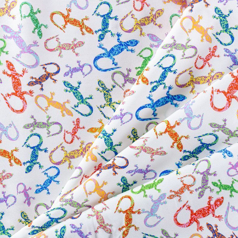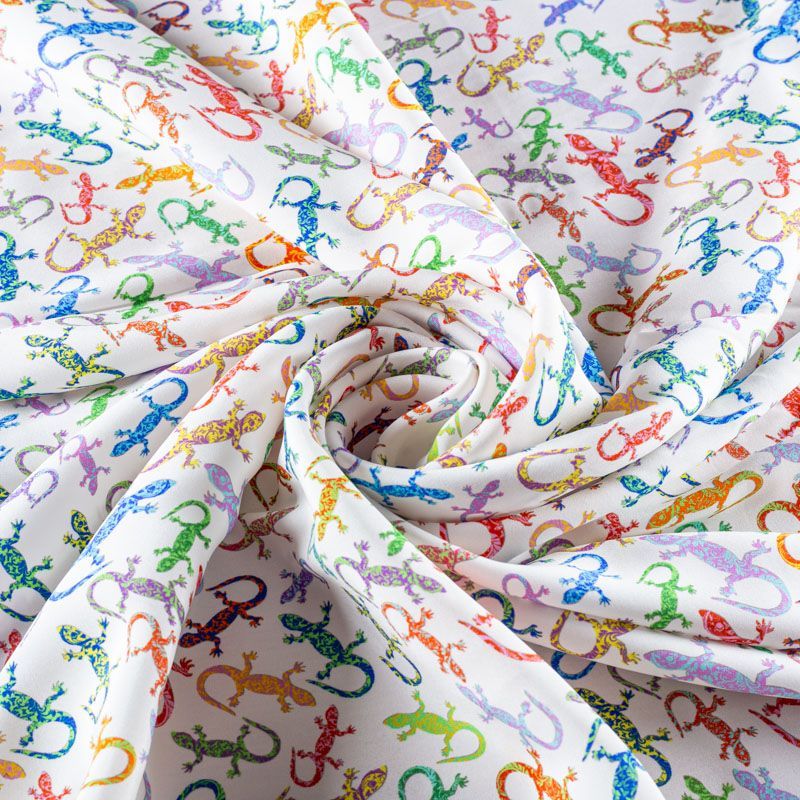 Итальянский шелк с матовой лицевой поверхностью и атласной изнанкой со стилизованными цветными ящерками на белом фоне, тонкий, слегка прозрачный, отлично драпируется, легкий и струящийся. Идеально подойдет для пошива платьев и сарафанов расклешенных моделей, с воланами, летящих юбок, топов, блузки, костюма в пижамном стиле.