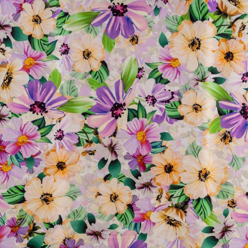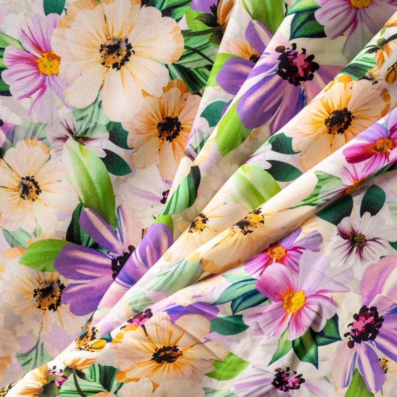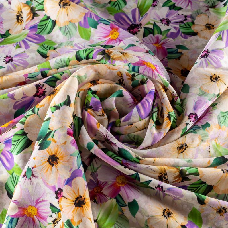 Итальянский матовый шелк в жемчужно-сером оттенке, который раскрывается легким блеском и придает материалу очень востребованную в сезонной палитре туманность, украшен летним цветочным принтом. Ткань средней плотности, не просвечивает, струится, хорошо драпируется, тянется благодаря эластану в составе. Поверхность матовая, креповая, изночная сторона - атласная. Подойдет для летних платьев, накидок, юбок, блузок, костюмов, широких брюк, домашней и пляжной одежды.