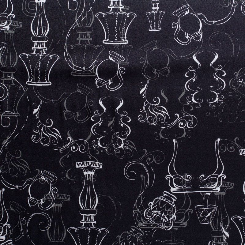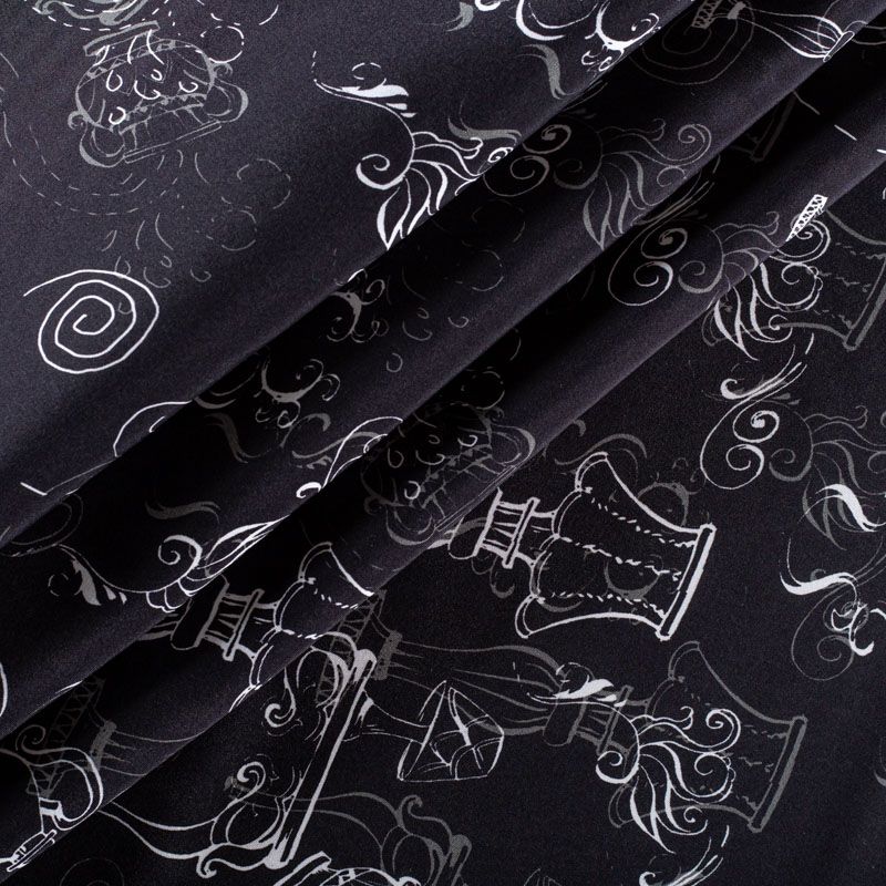 Итальянский матовый шелк черного цвета с узнаваемым принтом. Ткань тонкая, не просвечивается, отлично драпируется, легкая и струящаяся, тянется за счет эластана в составе, лицевая сторона креповая, изнанка - атласная. Идеально подойдет для пошива платьев и сарафанов расклешенных моделей, с воланами, рюшами, летящих юбок, топов, блузки, рубашки, костюма в пижамном стиле.