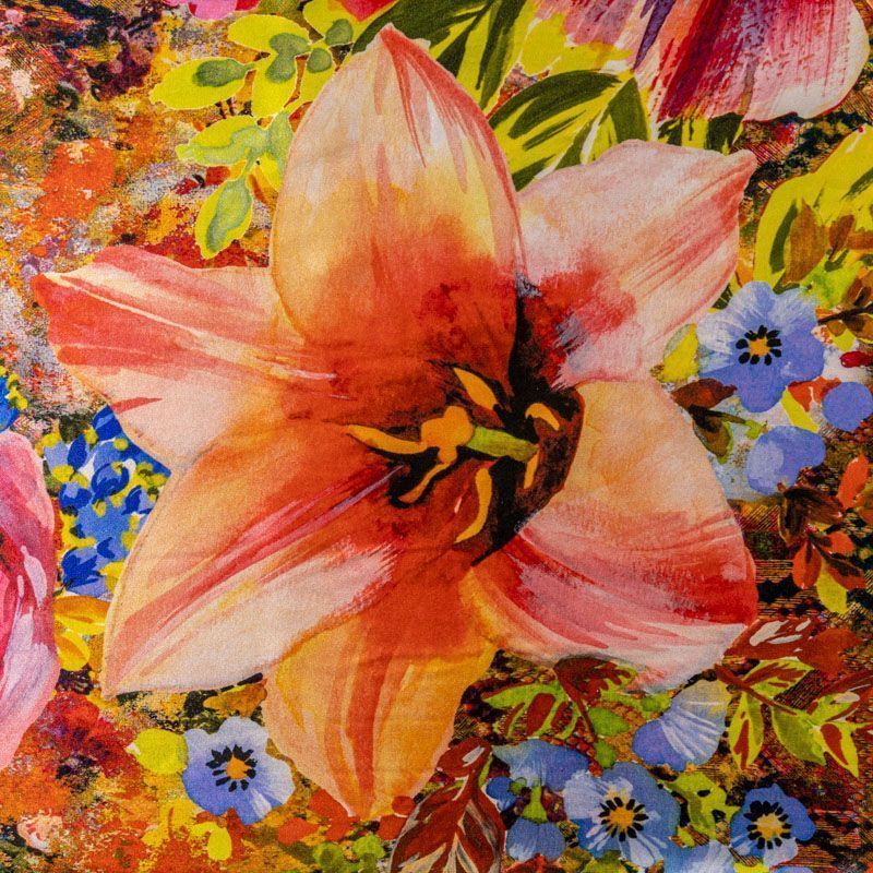 Итальянский натуральный шелк с атласной поверхностью, легкий, струящийся, хорошо драпируется, тянется за счет эластана в составе. Сочетание актуальных в текущем сезоне цветочного и анималистического принтов в насыщенных оттенках будет уместно  для пошива летнего сарафана, платья, блузки, костюма в пижамном стиле, широких брюк или юбки.