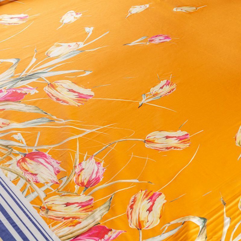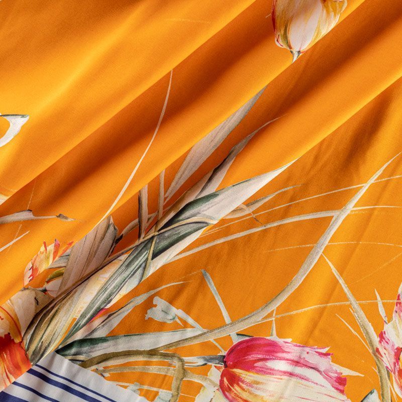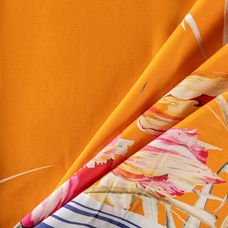 Итальянский шелк с матовой поверхностью, легкий, струящийся, хорошо драпируется. Яркий цветочный принт на оранжевом фоне дополнен по кромке полосками контрастного синего цвета. Ткань набирается объемом. Прекрасно подойдет для пошива летнего сарафана, платья, блузки, костюма в пижамном стиле, широких брюк или юбки.