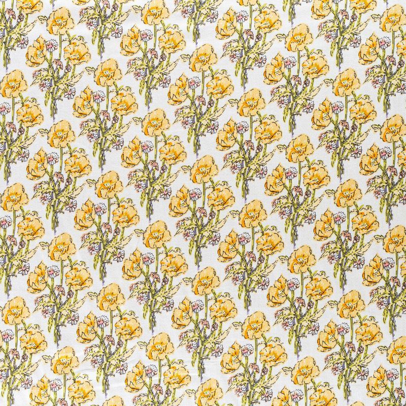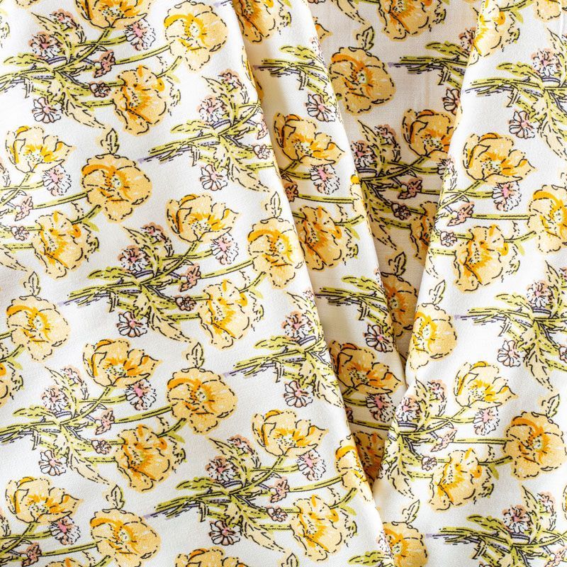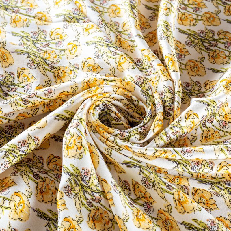 Плательно-блузочный штапель с добавлением шелка с летним растительным принтом. Ткань очень мягкая, нежная, пластичная, шелковистая на ощупь, хорошо драпируется, практичная. Особенно актуальна летом, шелк-штапель очень легкий, обволакивающий прохладой. Идеален для пошива летней детской одежды, сарафанов, платьев, юбок, блузок, домашней одежды: халатов, ночной пижамы.