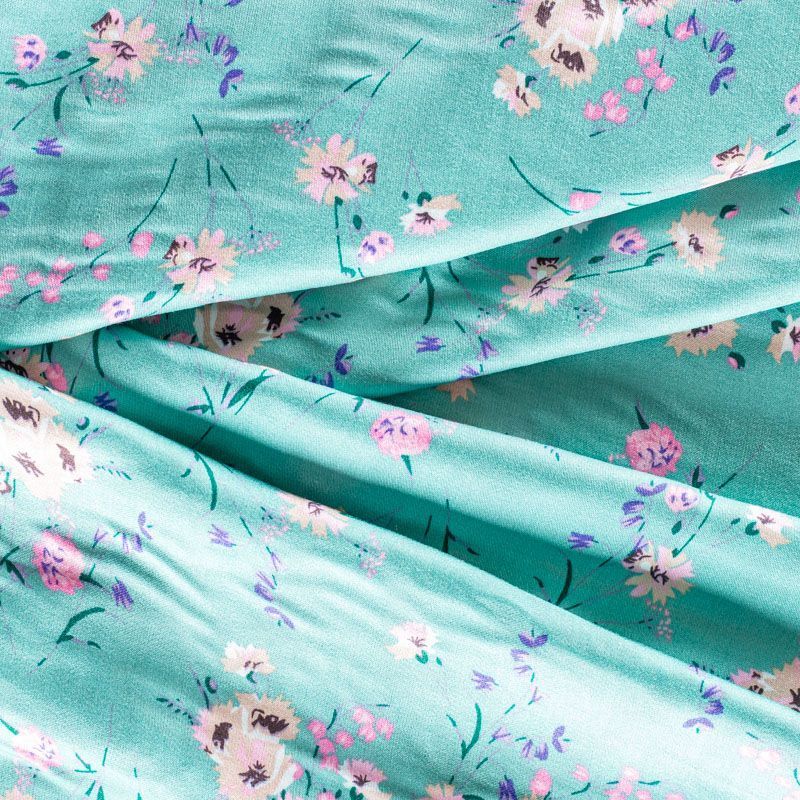 Плательно-блузочный штапель с добавлением шелка с цветочным принтом в мятно-бирюзовых оттенках. Ткань очень мягкая, нежная, пластичная, шелковистая на ощупь, хорошо драпируется, практичная. Особенно актуальна летом, шелк-штапель очень легкий, обволакивающий прохладой. Идеален для пошива летней детской одежды, сарафанов, платьев, юбок, блузок, домашней одежды: халатов, ночной пижамы.