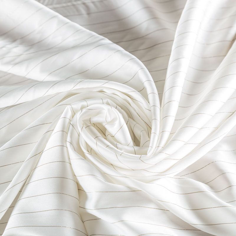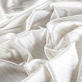 Тонкая, легкая, струящаяся ткань, декорированная тонкими вертикальными полосками люресовой нити, не просвечивает, очень нежная и прятная к телу, обладает благородным атласным блеском, хорошо драпируется, тянется за счет эластана в составе. Идеально подойдет для пошива блузок, платьев и юбок, а также топов, платков, домашней одежды.