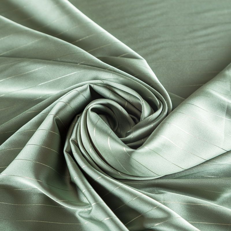 Тонкая, легкая, струящаяся ткань, декорированная тонкими вертикальными полосками люресовой нити, не просвечивает, очень нежная и прятная к телу, обладает благородным атласным блеском, хорошо драпируется, тянется за счет эластана в составе. Идеально подойдет для пошива блузок, платьев и юбок, а также топов, платков, домашней одежды.