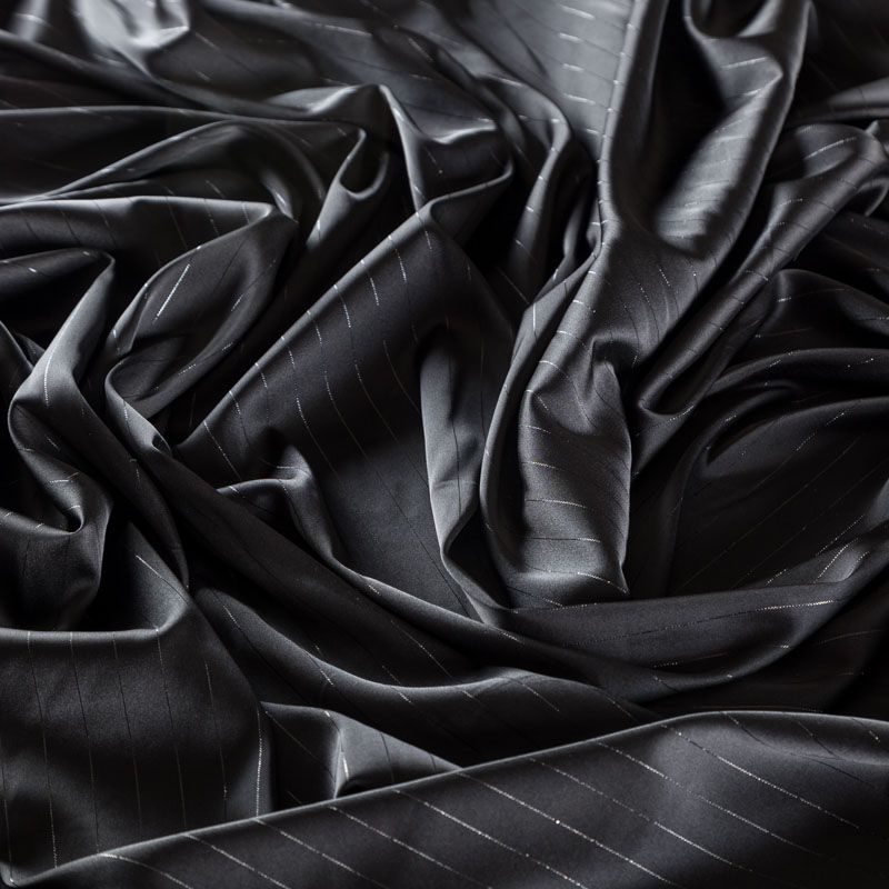 Тонкая, легкая, струящаяся ткань, декорированная тонкими вертикальными полосками люресовой нити, не просвечивает, очень нежная и прятная к телу, обладает благородным атласным блеском, хорошо драпируется, тянется за счет эластана в составе. Идеально подойдет для пошива блузок, платьев и юбок, а также топов, платков, домашней одежды.