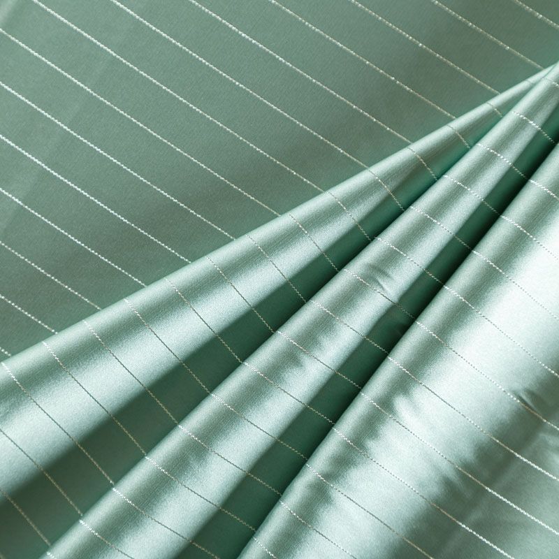 Тонкая, легкая, струящаяся ткань, декорированная тонкими вертикальными полосками люресовой нити, не просвечивает, очень нежная и прятная к телу, обладает благородным атласным блеском, хорошо драпируется, тянется за счет эластана в составе. Идеально подойдет для пошива блузок, платьев и юбок, а также топов, платков, домашней одежды.