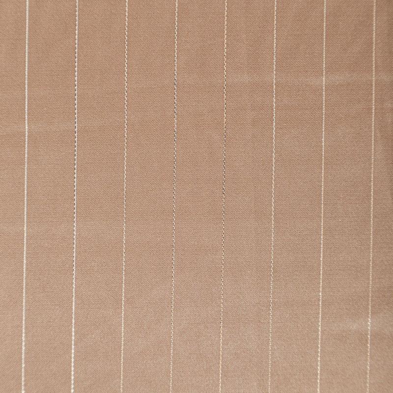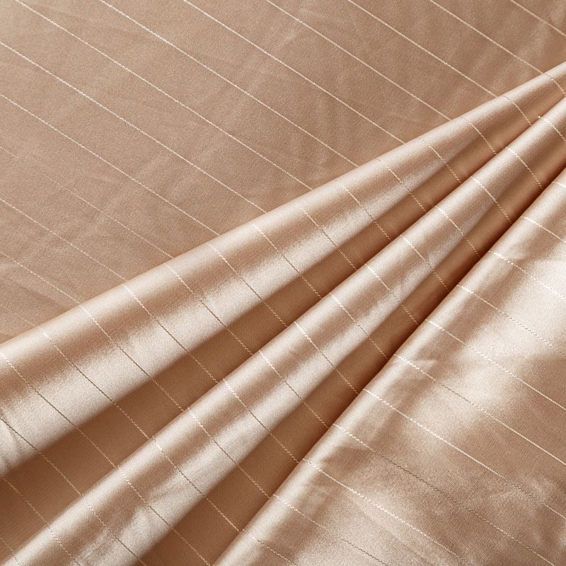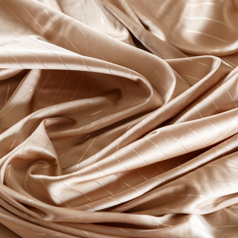 Тонкая, легкая, струящаяся ткань, декорированная тонкими вертикальными полосками люресовой нити, не просвечивает, очень нежная и прятная к телу, обладает благородным атласным блеском, хорошо драпируется, тянется за счет эластана в составе. Идеально подойдет для пошива блузок, платьев и юбок, а также топов, платков, домашней одежды.