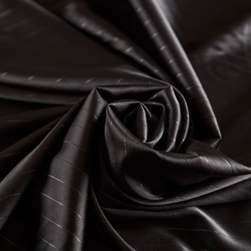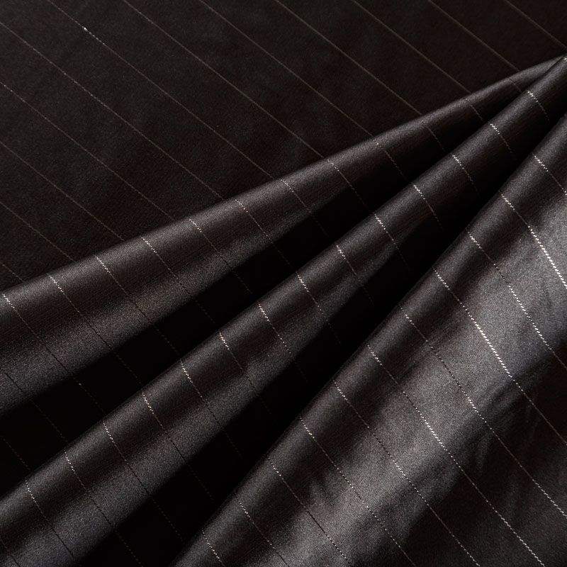 Тонкая, легкая, струящаяся ткань, декорированная тонкими вертикальными полосками люресовой нити, не просвечивает, очень нежная и прятная к телу, обладает благородным атласным блеском, хорошо драпируется, тянется за счет эластана в составе. Идеально подойдет для пошива блузок, платьев и юбок, а также топов, платков, домашней одежды.