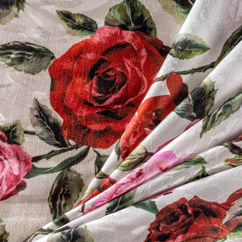 Итальянский жаккардовый шелк с цветочным принтом Поверхность ткани фактурная "под рептилию", со сдержанным блеском, смотрится оригинально и необычно. Ткань тонкая и легкая, немного просвечивает, может потребоваться подклад, струится, хорошо драпируется. Подойдет для летних вечерних и коктельных платьев, накидок, юбок, блузок, топов, костюмов, широких брюк, домашней и пляжной одежды.