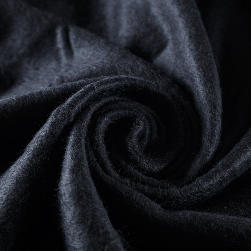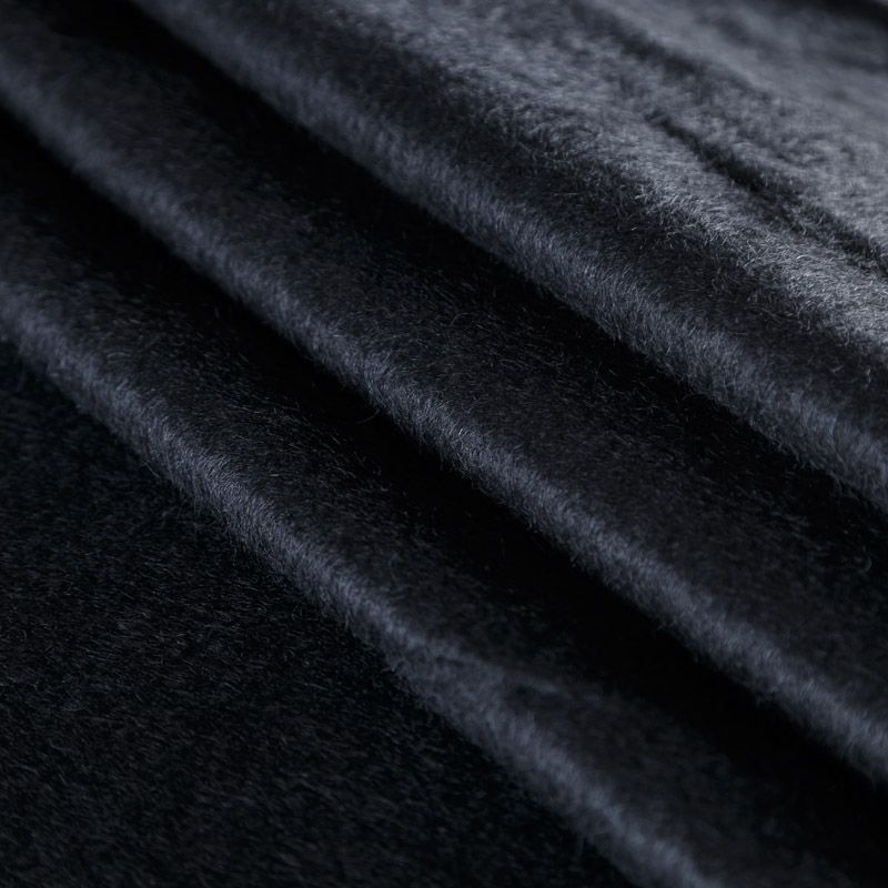 Итальянская костюмно-пальтовая шерсть в черном цвете. Ткань хорошо держит форму, приятная на ощупь, гибкая, средней толщины, при этом высокой плотности. Поверхность имеет короткий ворс. Подойдет для пошива теплого костюма, юбки, пальто, куртки, жакета, парки, кейпа, жакета или пончо.