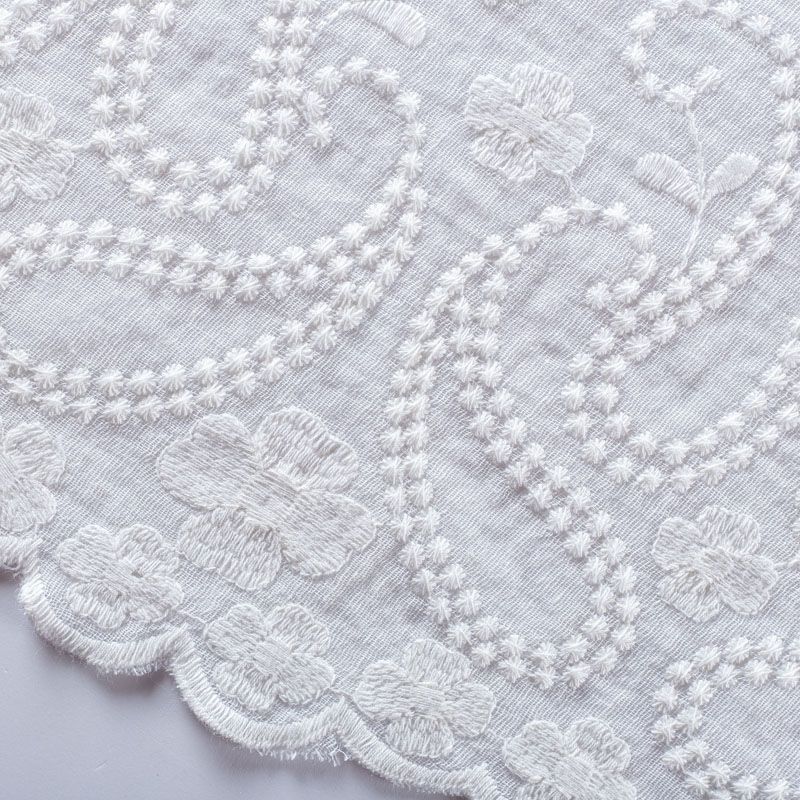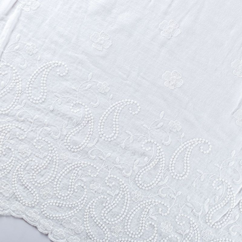 Мягкий и нежный итальянский батист белоснежного оттенка с цветочной вышивкой. Узор выполнен путём машинной вышивки нитками в цвет ткани и расположен преимущественно вдоль кромок. Набирается объемом. Фактура ткани неоднородная, имеет тенденцию к сминаемости, просвечивает, не тянется, приятная на ощупь. Идеально подходит для создания летних платьев, сарафанов, юбок, блузок и топов.