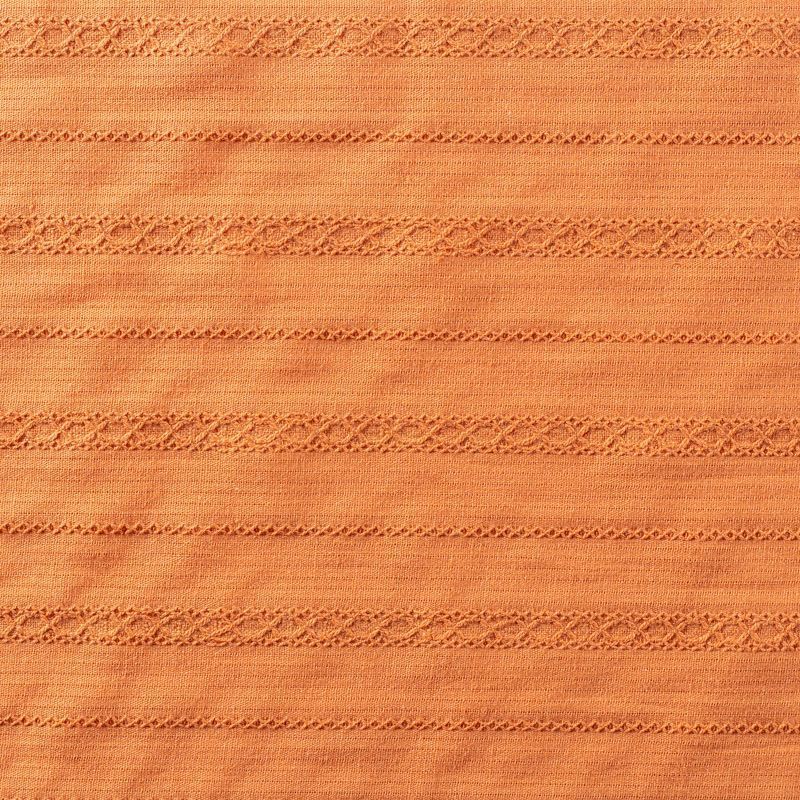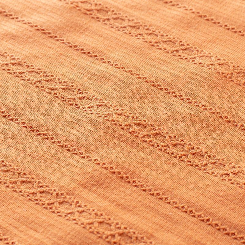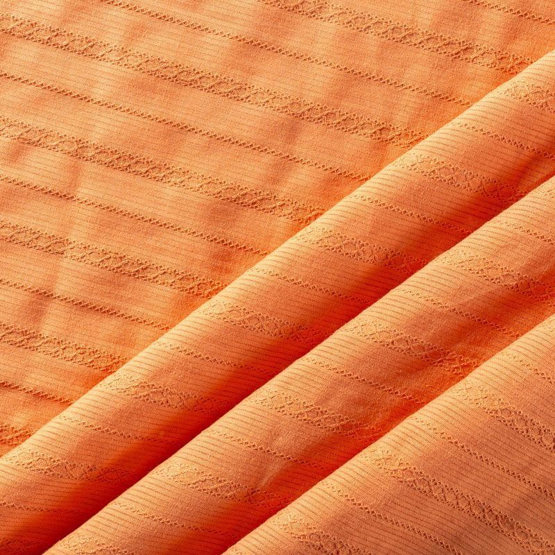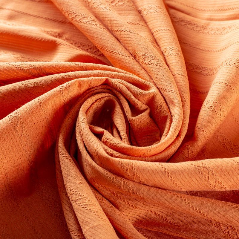 Мягкий и нежный итальянский хлопок оранжевого оттенка с изящной вышивкой. Узор выполнен путём машинной вышивки нитками в цвет ткани и расположен вдоль кромки. Фактура ткани неоднородная, имеет тенденцию к сминаемости, не много просвечивает, не тянется, приятная на ощупь. Идеально подходит для создания летних платьев, сарафанов, юбок, блузок и топов.
