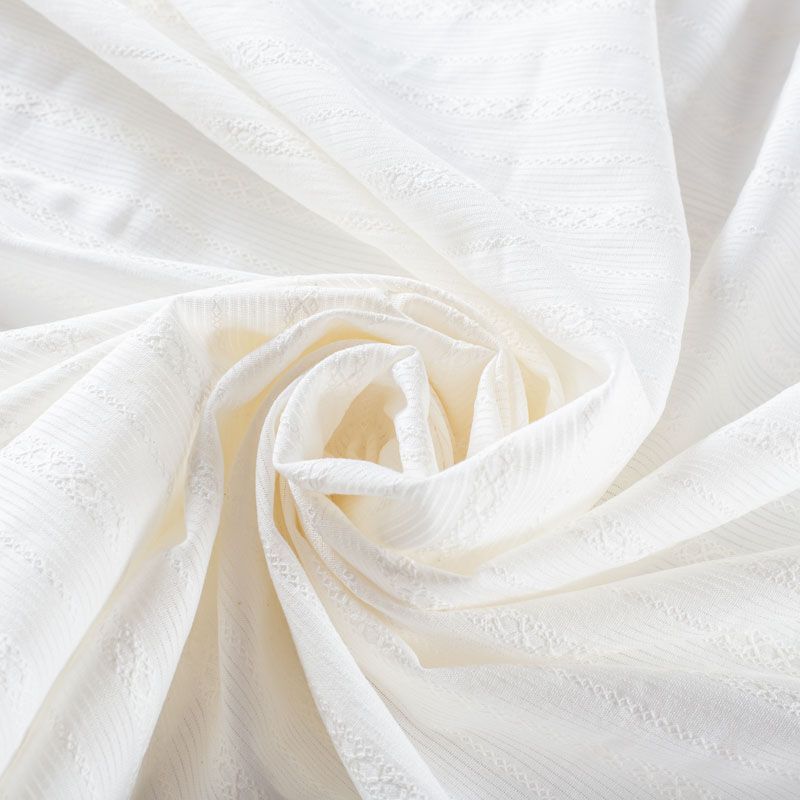 Мягкий и нежный итальянский хлопок молочного оттенка с изящной вышивкой. Узор выполнен путём машинной вышивки нитками в цвет ткани и расположен вдоль кромки. Фактура ткани неоднородная, имеет тенденцию к сминаемости, не много просвечивает, не тянется, приятная на ощупь. Идеально подходит для создания летних платьев, сарафанов, юбок, блузок и топов.
