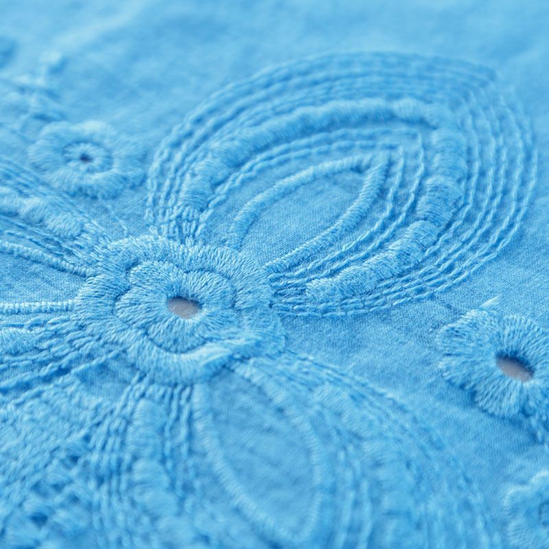 Итальянский мягкий и нежный хлопок насыщенного голубого оттенка с изящной вышивкой. Узор выполнен путём машинной ажурной вышивки нитками в цвет ткани и расположен вдоль кромки. Обе кромки ткани оформлены фигурными фестонами. Фактура ткани однородная, имеет тенденцию к сминаемости, немного просвечивает, не тянется, приятная на ощупь. Идеально подходит для создания летних платьев, сарафанов, юбок, блузок и топов.