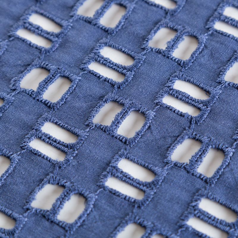 Мягкий и нежный хлопок фиолетово-синего оттенка с геометрической вышивкой и перфорацией. Узор выполнен путём машинной вышивки нитками в цвет ткани и расположен по всему полотну. Фактура ткани однородная, имеет тенденцию к сминаемости, не тянется, приятная на ощупь. Может потребоваться подклад. Идеально подходит для создания летних платьев, сарафанов, юбок, блузок и топов.