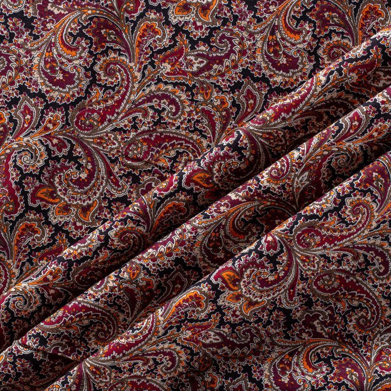 Плательно-блузочный штапель с принтом пейсли в коричнево-желтых оттенках на черном фоне. Мягкий, тонкий, нежный, пластичный, приятный на ощупь, хорошо драпируется, практичный. Подойдет для пошива платья, топа, блузки, рубашки, юбки, летних брюк.