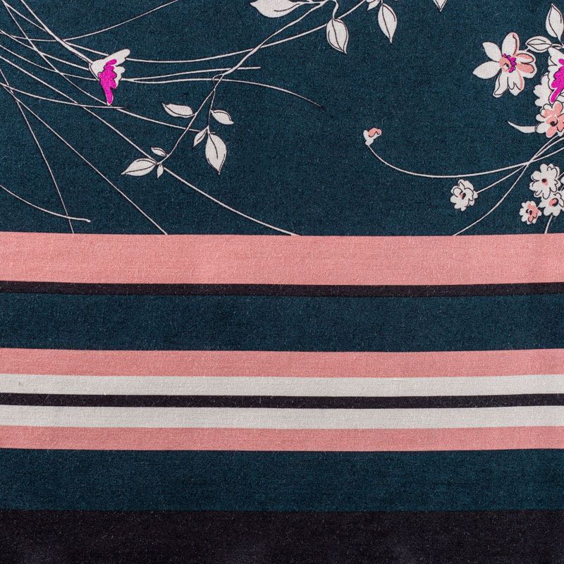 Итальянский плательно-блузочный штапель глубокого сине-зеленого оттенка с цветочным принтом и декоративным кантом вдоль кромки. Мягкий, нежный, пластичный, приятный на ощупь, хорошо драпируется, практичный. Особенно актуален летом, он очень легкий, обволакивающий прохладой. Идеален для пошива летней детской одежды, сарафанов, платьев, юбок, блузок, домашней одежды: халатов, ночной пижамы.