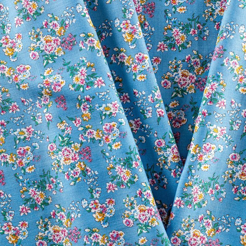 Плательно-блузочный штапель с цветочным принтом на серо-голубом фоне. Мягкий, тонкий, нежный, пластичный, приятный на ощупь, хорошо драпируется, практичный. Подойдет для пошива платья, топа, блузки, рубашки, юбки, летних брюк.