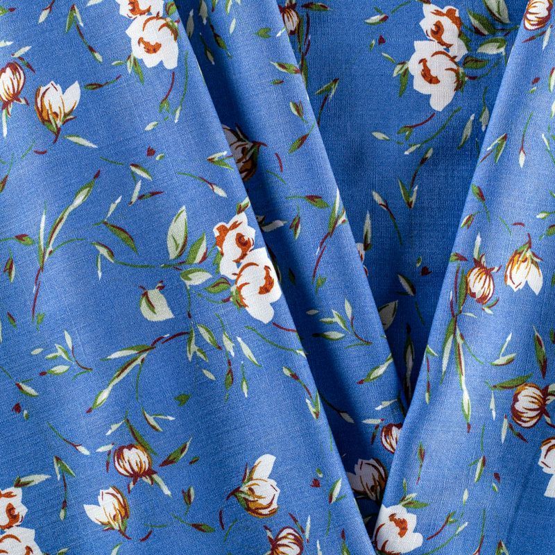 Плательно-блузочный штапель с цветочным принтом на темно-голубом фоне. Мягкий, тонкий, нежный, пластичный, приятный на ощупь, хорошо драпируется, практичный. Подойдет для пошива платья, топа, блузки, рубашки, юбки, летних брюк.