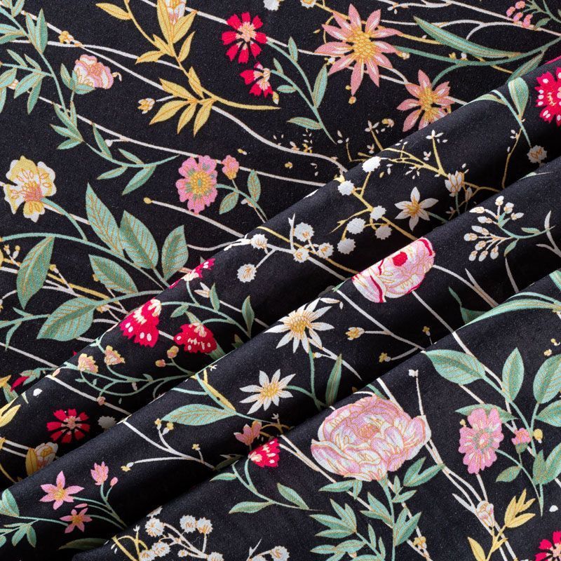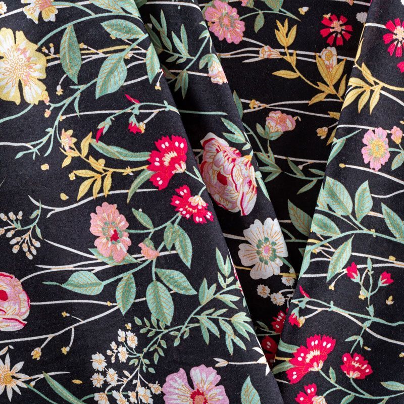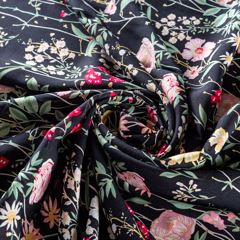 Плательно-блузочный штапель с элегантным цветочным принтом на черном фоне. Мягкий, тонкий, нежный, пластичный, приятный на ощупь, хорошо драпируется, практичный. Подойдет для пошива платья, топа, блузки, рубашки, юбки, летних брюк.