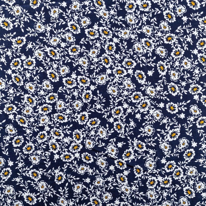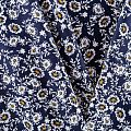 Плательно-блузочный штапель с не крупным цветочным принтом на темно-синем фоне. Мягкий, тонкий, нежный, пластичный, приятный на ощупь, хорошо драпируется, практичный. Подойдет для пошива платья, топа, блузки, рубашки, юбки, летних брюк.